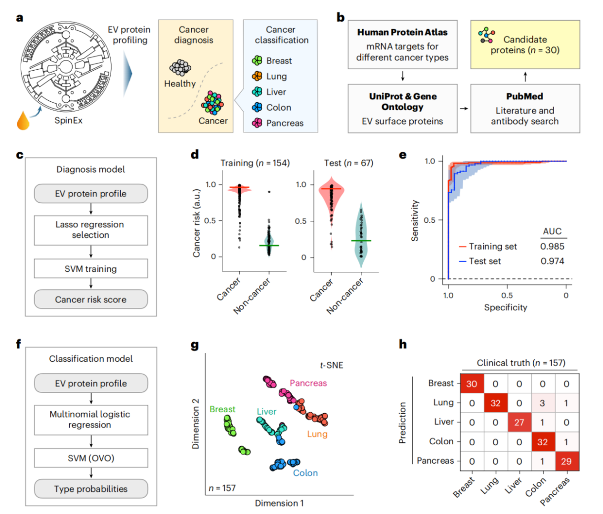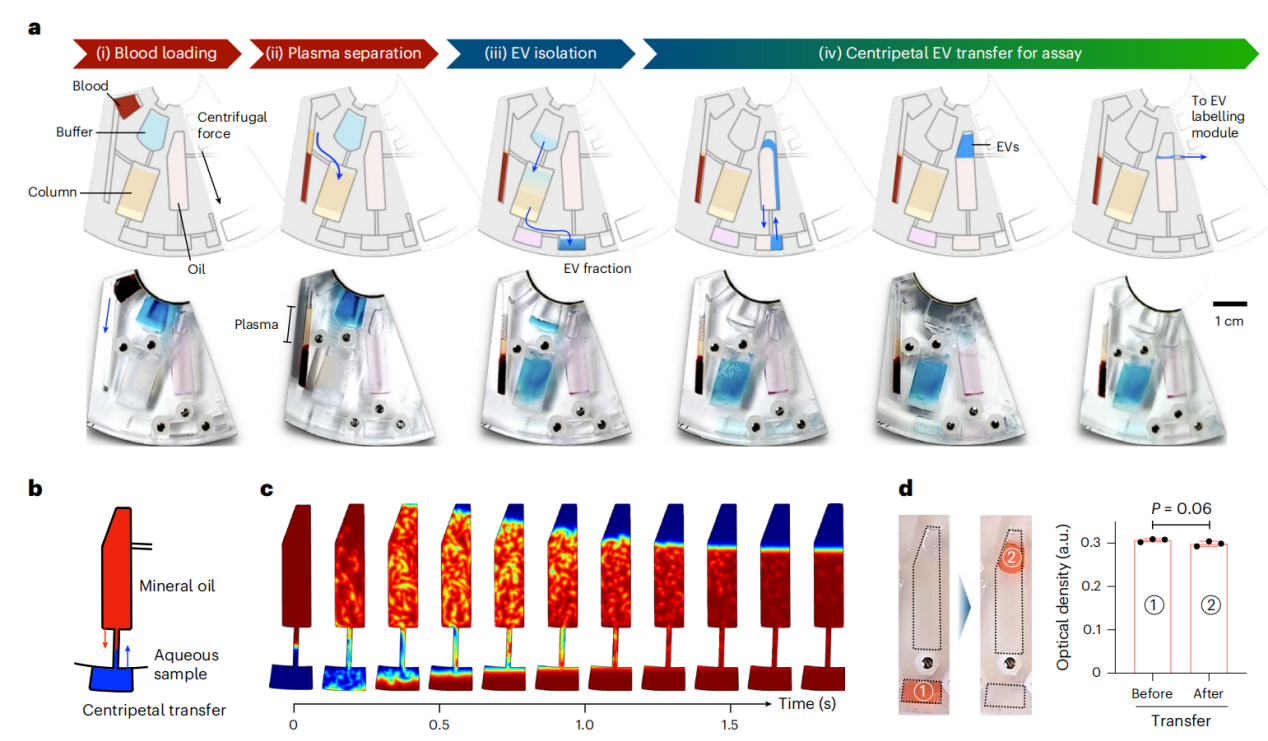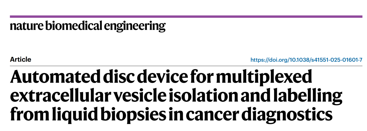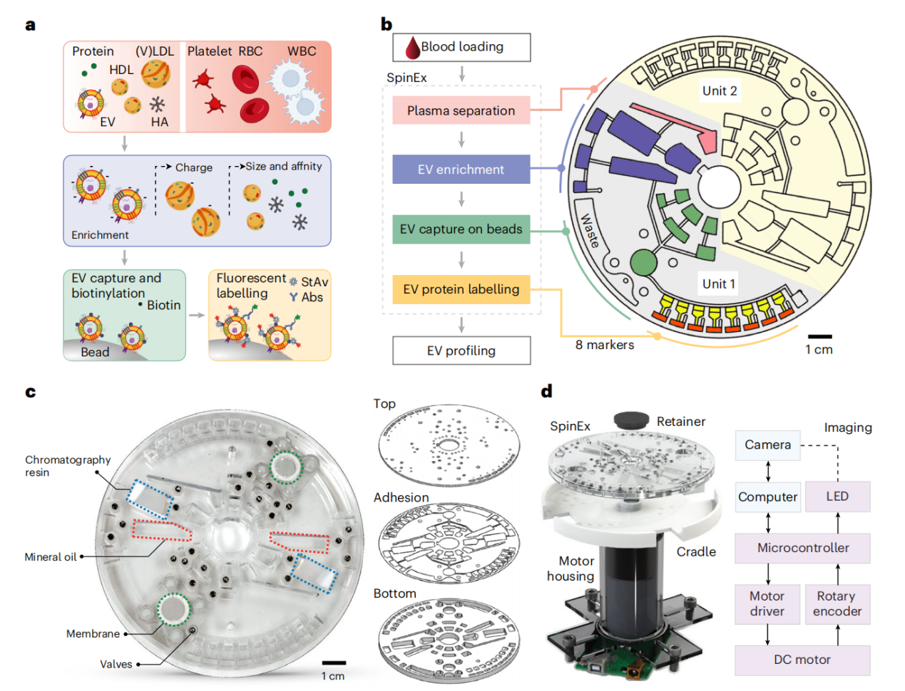Nat Biomed Eng | 75 分钟完成检测!集成化离心式圆盘微流控装置:癌症液体活检中细胞外囊泡的高效富集与蛋白谱分析发表时间:2026-02-03 15:13 期刊:Nature Biomedical Engineering ( IF =26.6 ) 发表日期:2026年1月28日 原文链接:https://doi.org/10.1038/s41551-025-01601-7 液体活检作为一种微创手段,可获取肿瘤相关分子信息,用于疾病监测。细胞外囊泡(EV)作为细胞释放的膜包纳米颗粒,携带反映母细胞状态的生物分子,是极具潜力的生物标志物。然而,当前EV分离方法通常耗时、依赖人工操作且易受污染,尤其是血液中大量存在的脂蛋白颗粒与EV在尺寸和密度上相似,干扰分析。因此,开发一种自动化、高通量且高纯度的EV处理系统是推动EV诊断临床转化的关键。 来自美国麻省总医院及韩国庆北大学的研究者们提出了名为SpinEx 的集成化离心式圆盘微流控装置,实现了从全血中自动化分离、富集和多重免疫标记EV的全流程处理。该系统在单一样本中可同时检测16种蛋白质标志物,并在临床血浆样本中验证了其在癌症检测(90%准确率)和五种常见癌症分类(96%准确率)中的高灵敏度和特异性,为EV临床检测提供了高效、可扩展的解决方案。该研究成果以“Automated disc device for multiplexed extracellular vesicle isolation and labelling from liquid biopsies in cancer diagnostics”为题,发表在《Nature Biomedical Engineering》期刊上。