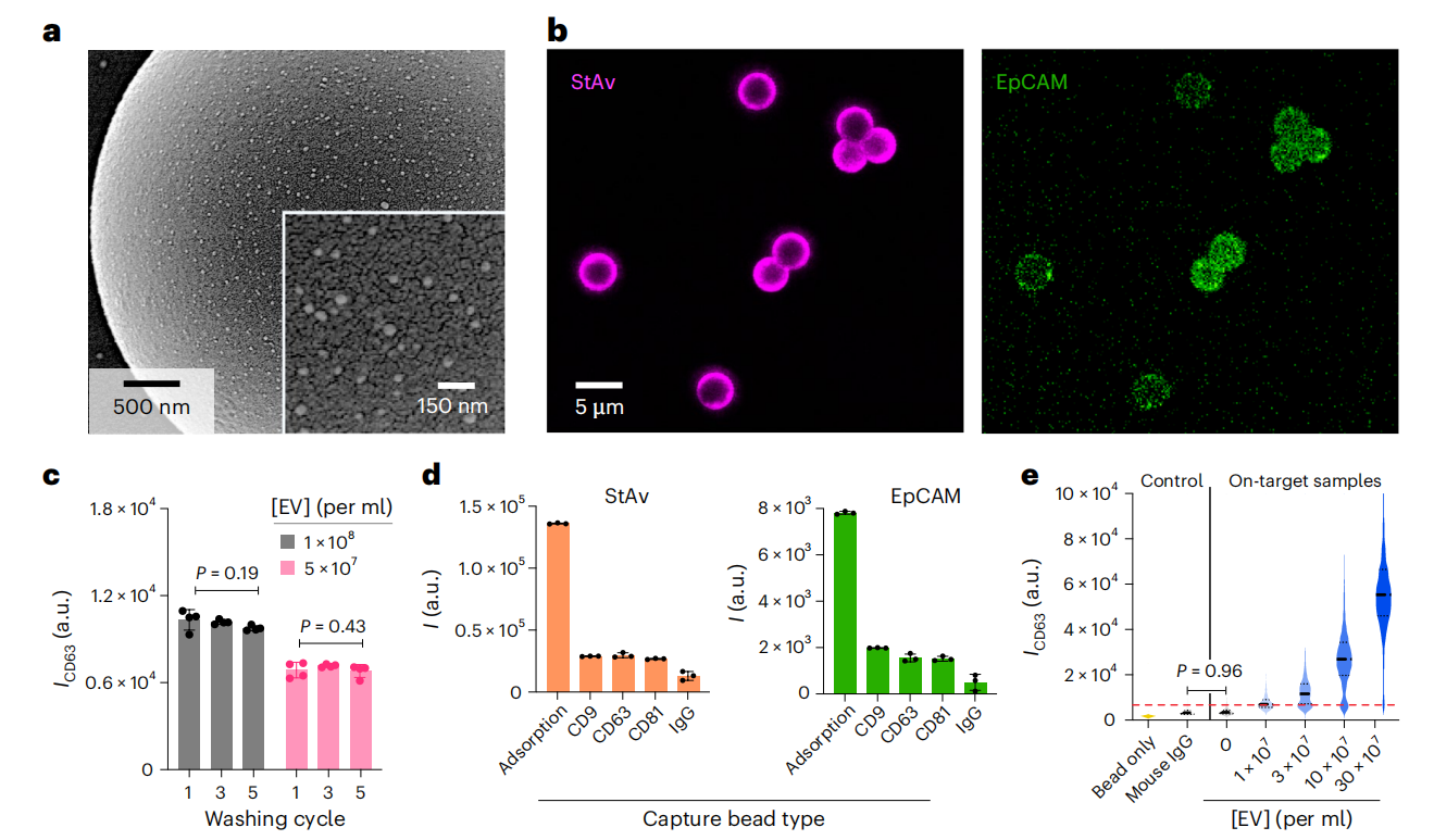 图5对比并优化了EV在微珠上的捕获策略。实验证明,基于物理吸附的捕获方法相较于依赖特定表面抗原的免疫捕获,能实现更高且更稳定的EV捕获效率,这是由于吸附法避免了因EV表面标志物表达异质性造成的捕获偏差,从而为无偏倚的群体分析提供了优势。